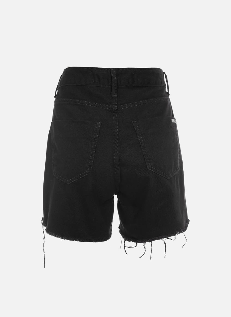 Confeccionada em sarja, a Bermuda possui modelagem reta, fechamento por zíper botão frontal, cós com passantes, cinco bolsos, detalhes destroyed e puídos, barra desfiada e acabamento pespontado.