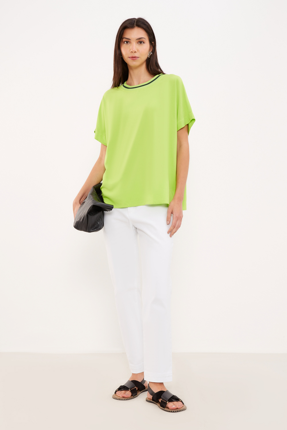Confeccionada em um tecido leve e fluido de viscose, a Blusa Ampla Decote Retilínea proporciona um conforto inigualável. Com seu comprimento regular, o modelo apresenta um shape solto que se adapta perfeitamente ao corpo. Suas mangas curtas amplas conferem um toque moderno ao look, enquanto o decote canoa com detalhe contrastante acrescenta um charme especial. Aproveite para combinar com peças e acessórios da coleção!