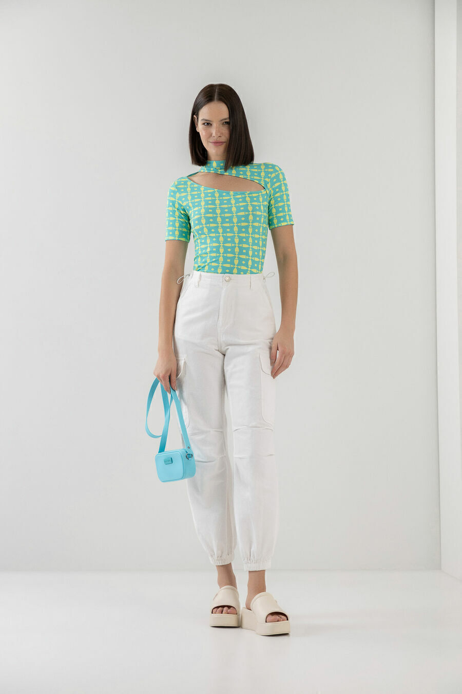 Nessa blusa canelada, a modernidade vem em ondas através do recorte cut out assimétrico. Vista sua alma de leveza e cor com a estampa exclusiva que é um verdadeiro poema visual e se complementa muito bem com partes de baixo em tons vibrantes de vermelho e laranja.