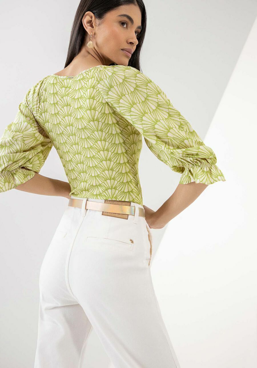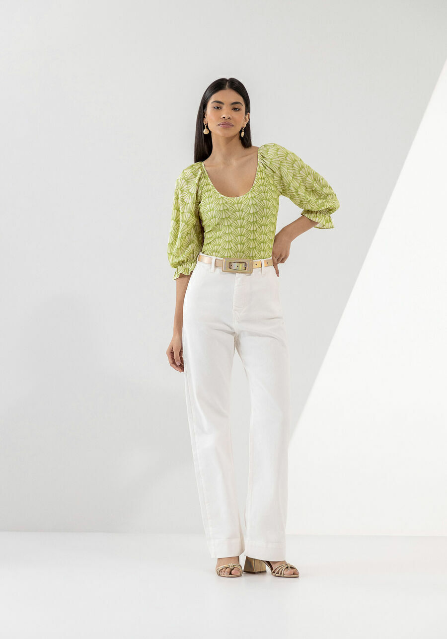 Sua estampa exclusiva, inspirada na beleza das Filipinas, exala singularidade e charme, enquanto as mangas 3/4 bufantes com recorte e o babado na barra adicionam um toque romântico e moderno à peça. O decote mais aberto realça o visual, tornando-a ideal para composições refinadas, como com uma saia midi jeans, para um look contemporâneo e cheio de personalidade.