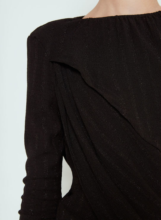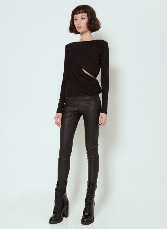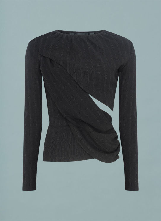 A blusa é confeccionado em malha black, posusi mangas longas, modelagem ajustada ao corpo, tecido sobreposto na manga direita e em parrte do busto, detalhe franzido na gola e zíper invisível na lateral.