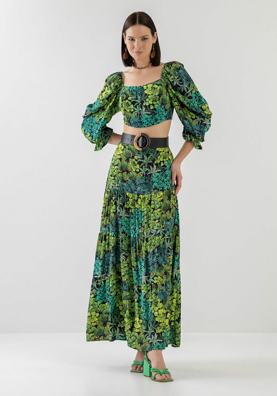 Como uma ode à natureza, essa blusa corset cropped traz uma estampa exclusiva que celebra a riqueza das florestas brasileiras. Com mangas bufantes, a peça é feita em viscose, garantindo um caimento impecável ao corpo. Combine com uma saia midi para um visual elegante e autêntico.