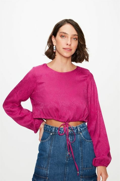 A blusa de mangas longas tem ajuste por cordão do mesmo tecido na cintura que atualiza seu visual com facilidade. Ajustando a peça fica mais ou menos encurtada, e pode ser amarrada em forma de laço ou amarrada na cintura de acordo com a preferência. Combine com cinturas altas para um efeito alongador e sofisticado.