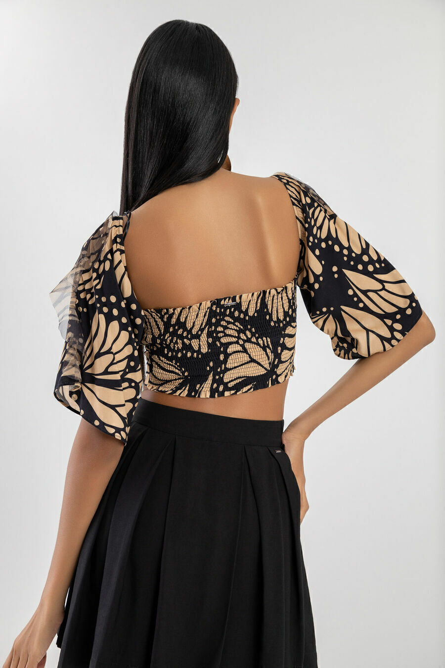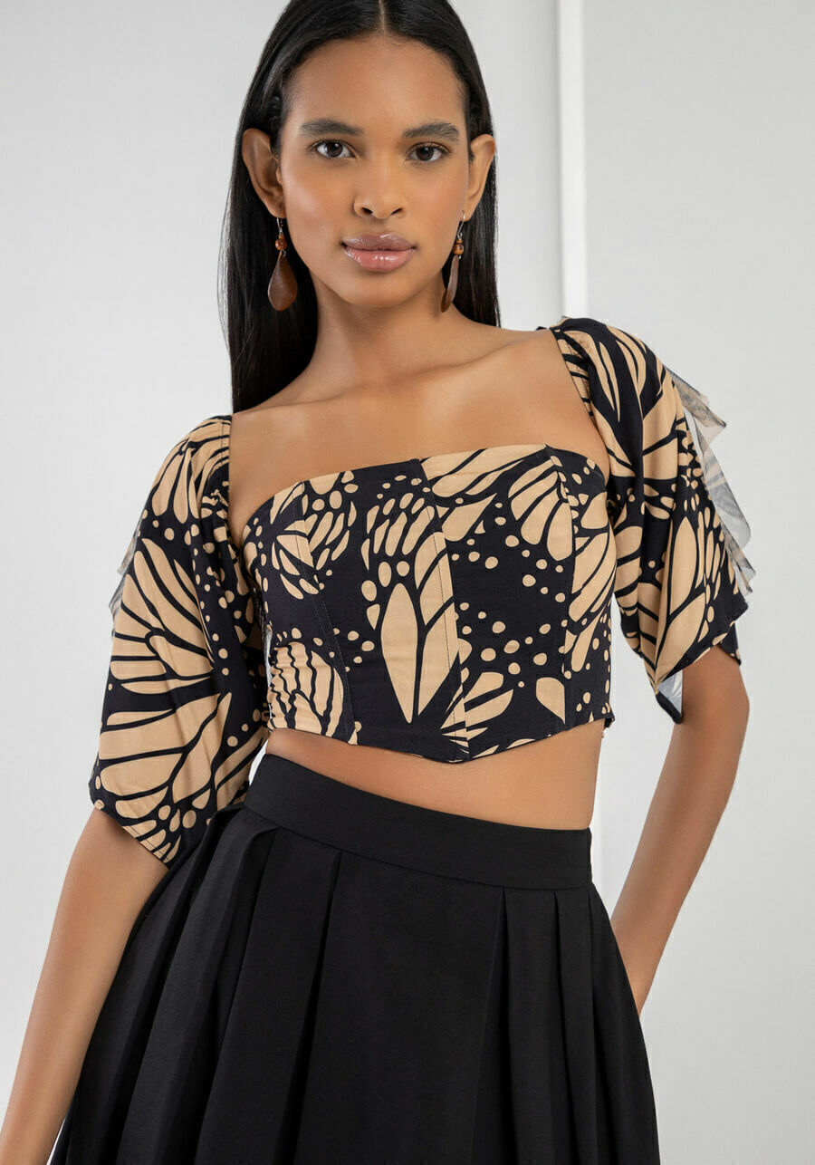 Desfrute de toda a beleza e sofisticação que essa blusa com modelagem corset traz aos seus dias. Além de moderna, realça a sua beleza natural, enquanto a estampa exclusiva inspirada nas florestas do Brasil representa a força da natureza. As mangas flare com delicado detalhe em tule evocam uma poesia sofisticada para combinar com saia evasê.
