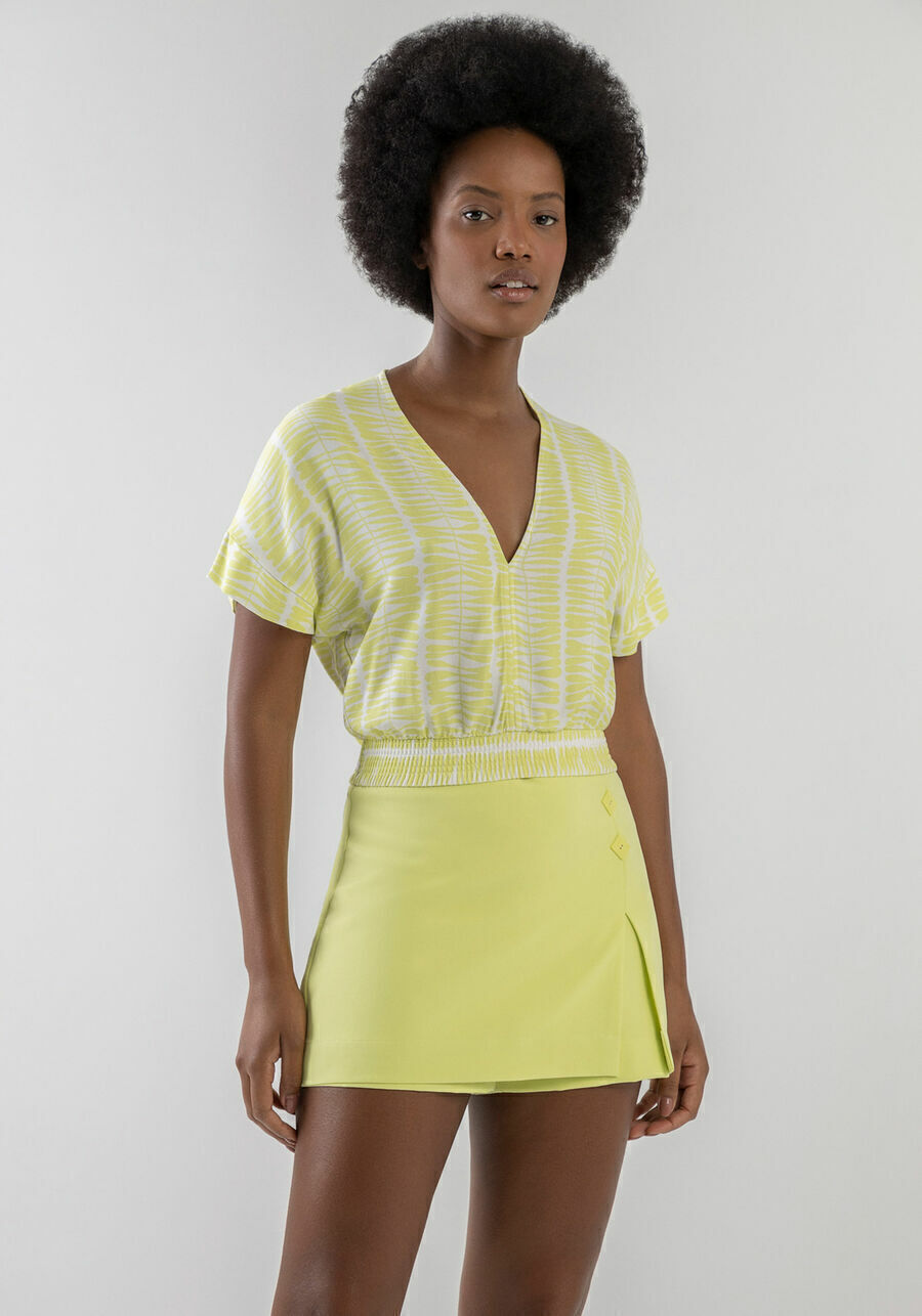 Uma blusa em viscose com elástico na barra que é uma poesia em vestir. Com estampa atemporal em tom de amarelo, essa peça traz alegria ao visual. Sua modelagem é fluida, completada pelo elástico na barra, perfeita para um look descontraído. Combine com shorts jeans ou saias midi para um visual leve.
