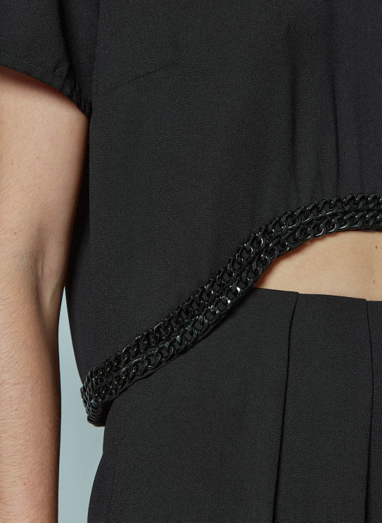 A Blusa é confeccionada em tecido plano, possui decote redondo, modelagem cropped e correntes de metal na cintura e aviamentos personalizados. Composição: 100% Poliéster Cor: Preto