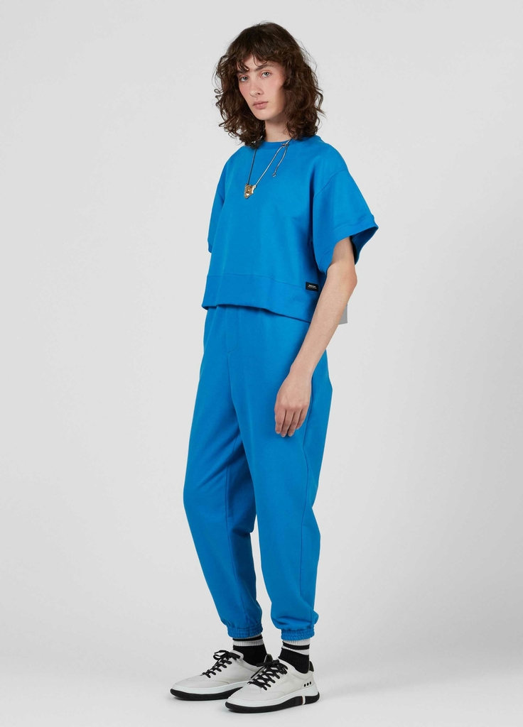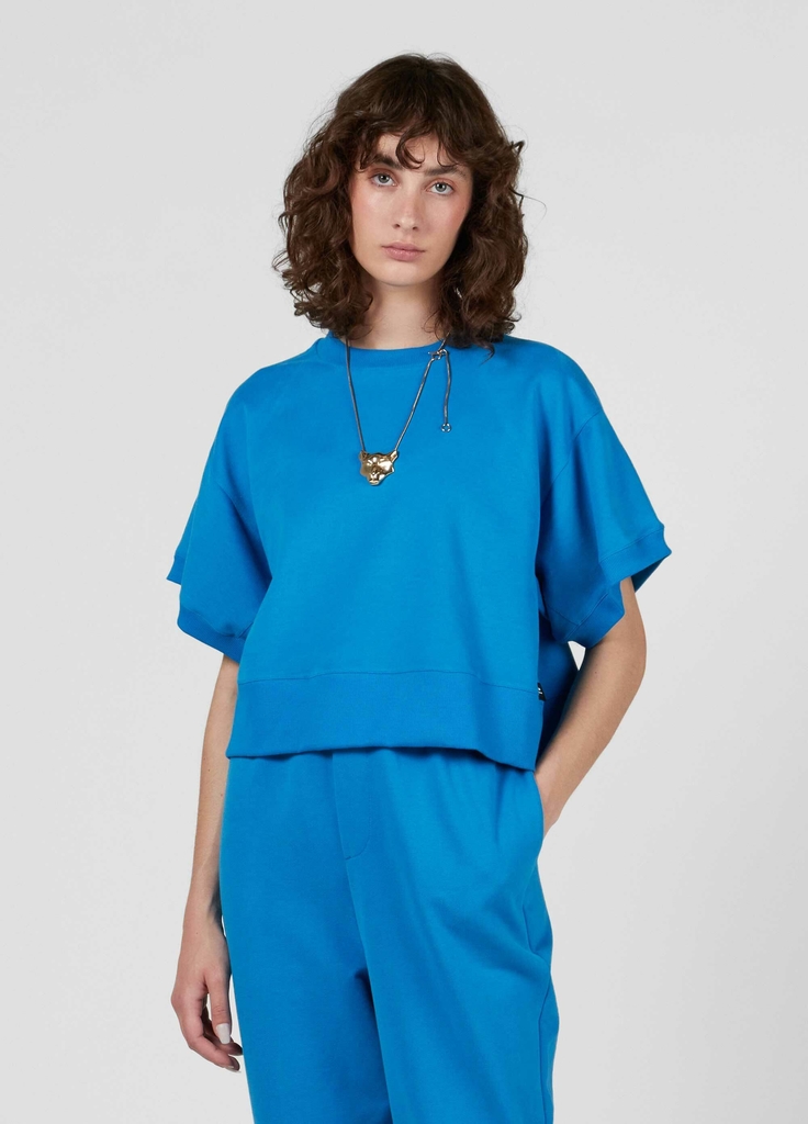 Blusa feminina feita em moletom felpado de algodão e poliéster. A peça tem mangas curtas e comprimento curto. Ela tem caimento ligeiramente over. A peça tem uma etiqueta de assinatura externa. Essa é uma peça regenerate life, pois foi produzida com algodão nacional certificado seguindo critérios minuciosos de redução dos impactos ambientais e sociais durante seu cultivo. Seu processo produtivo utiliza energia renovável, reduz o consumo de água e fomenta as cadeias produtivas brasileiras. Essa peça também contém pet reciclado em sua composição. O brasil descarta hoje seis bilhões de garrafas pet por ano, um material que leva cerca de 300 anos para se decompor. A sua reutilização evita o descarte inapropriado, reduzindo o aumento da poluição no planeta. Composição: 50% algodão certificado 50% poliéster pet. Composição: 50% algodão certificado 50% poliéster pet.