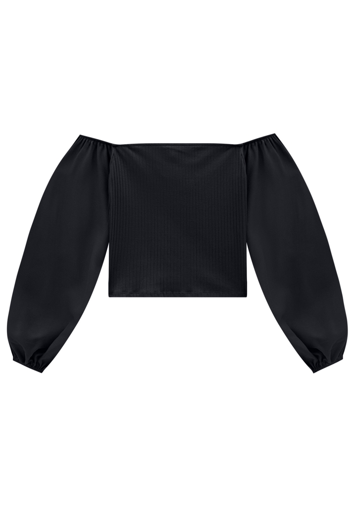 Blusa ombro a ombro que faz uma sofisticada mistura de malha e viscose, além das mangas bufantes muito modernas. Uma peça que transita da praia à cidade, combinando tanto com shorts jeans, quanto com calça cargo.