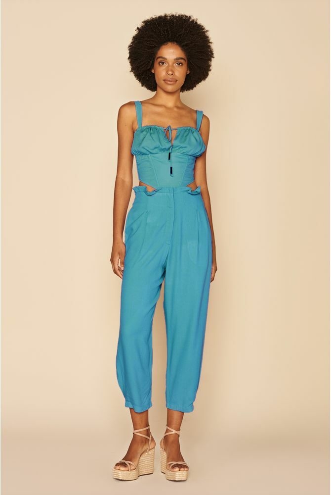 Pensando nisso, a Calça possui pregas frontais e babados no cós, que dão um toque moderno à peça. Além disso, ela pode ser combinada com cropped para um conjunto confortável e sofisticado.