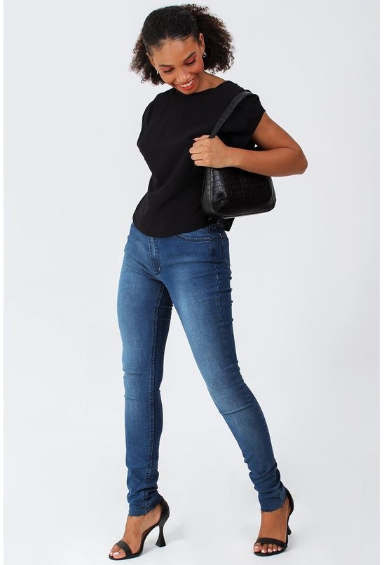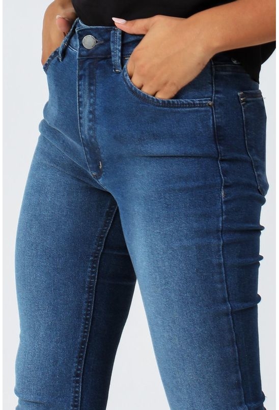 Confeccionada em jeans com lavagem média, a calça possui cós com passantes, fechamento frontal por zíper e botão, bolsos frontais e posteriores, modelagem skinny e acabamento pespontado.
