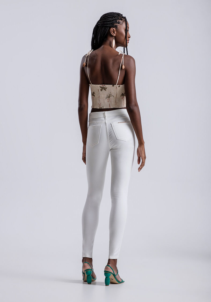 Calça skinny em Sarja Off White, uma peça que comunica leveza aos look e intensifica o mood beach da Lez a Lez através do bordado de coqueiros. Veste perfeitamente ao corpo através da tecnologia Every Day e Elastic Denim com 40% de elasticidade, além de ficar linda com estampas claras