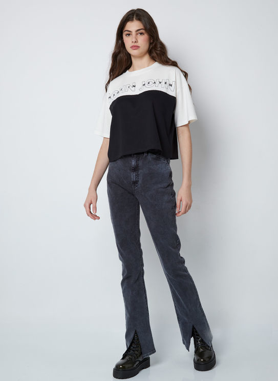 Confeccionada em sarja, a Calça possui modelagem semi boot, cós com passantes, fechamento frontal por zíper e botão, detalhe de fenda na barra e acabamento pespontado.
