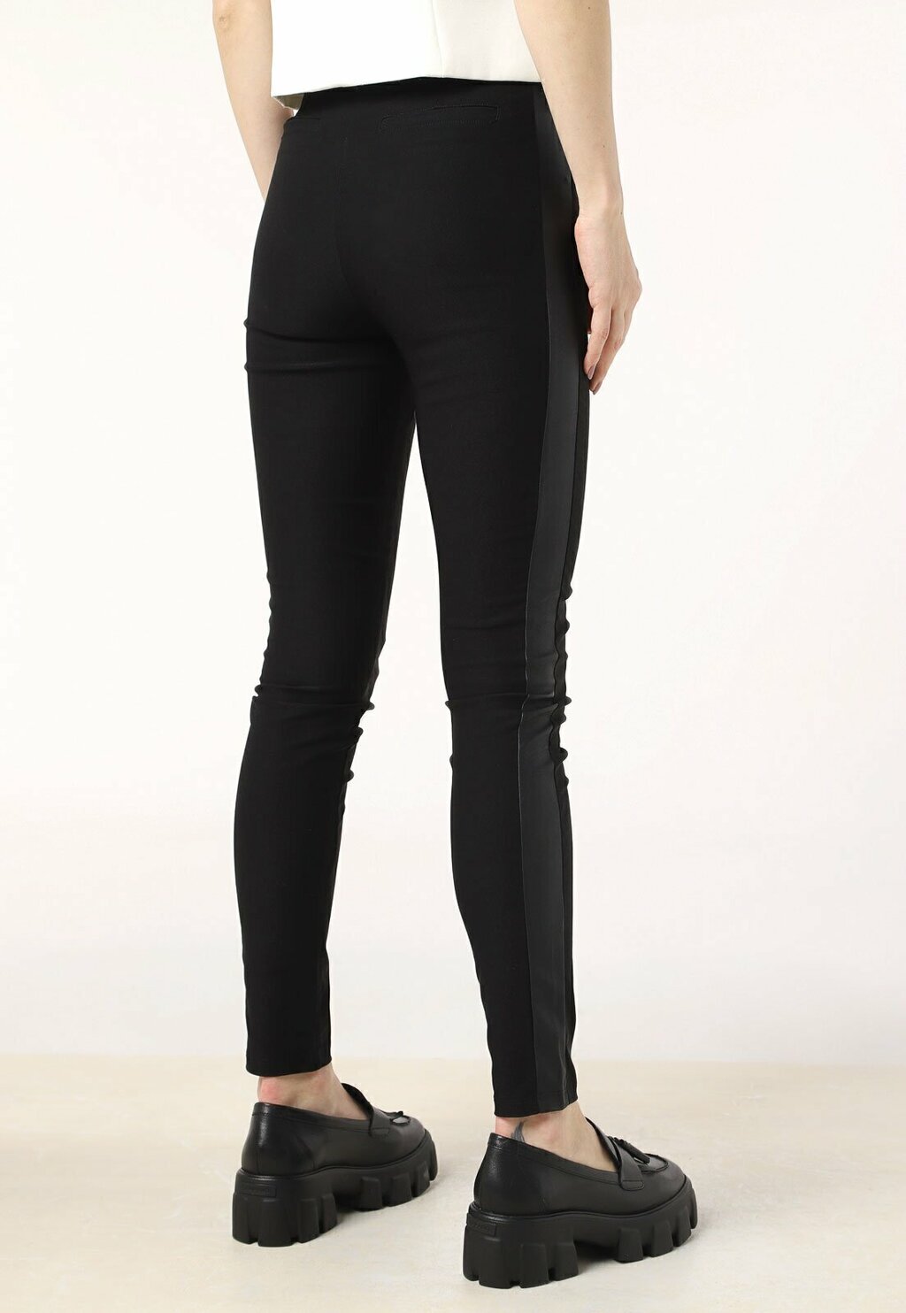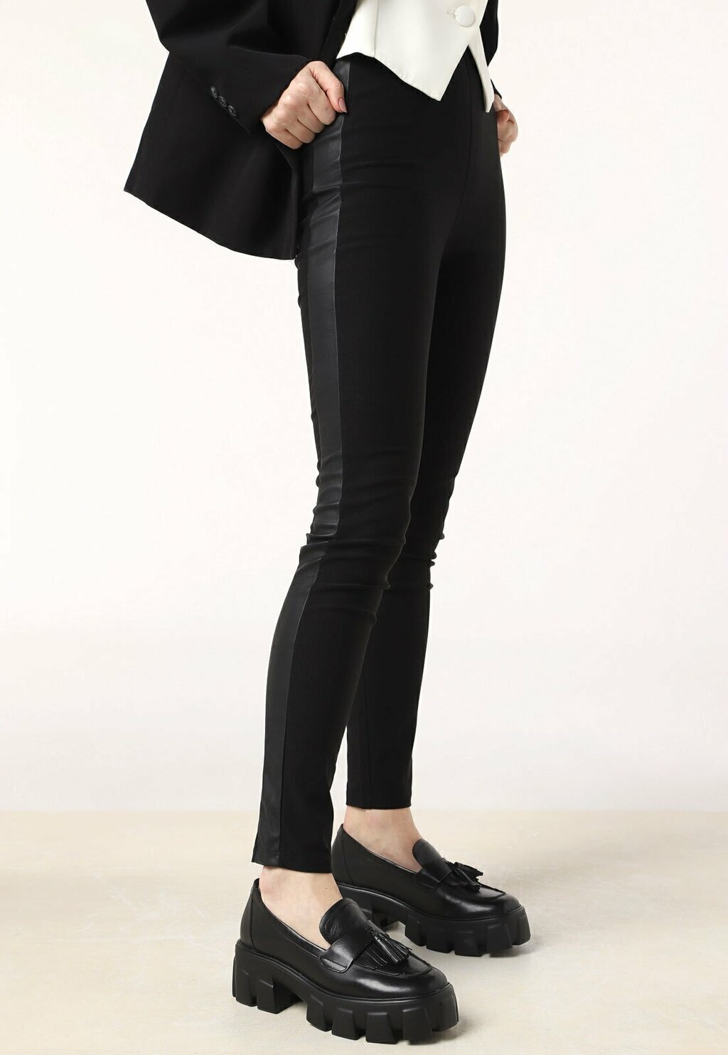 Calça skinny em tecido encorpado com elasticidade que proporciona ajuste perfeito ao corpo, além de evidenciar as curvas com sofisticação. Os recortes laterais em PU trazem um toque de modernidade para look com camisa cropped.