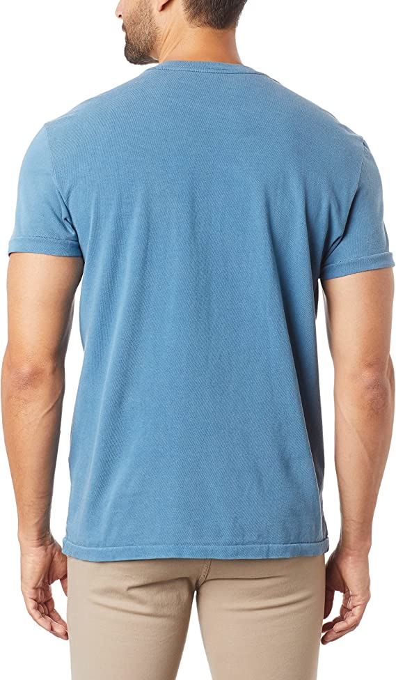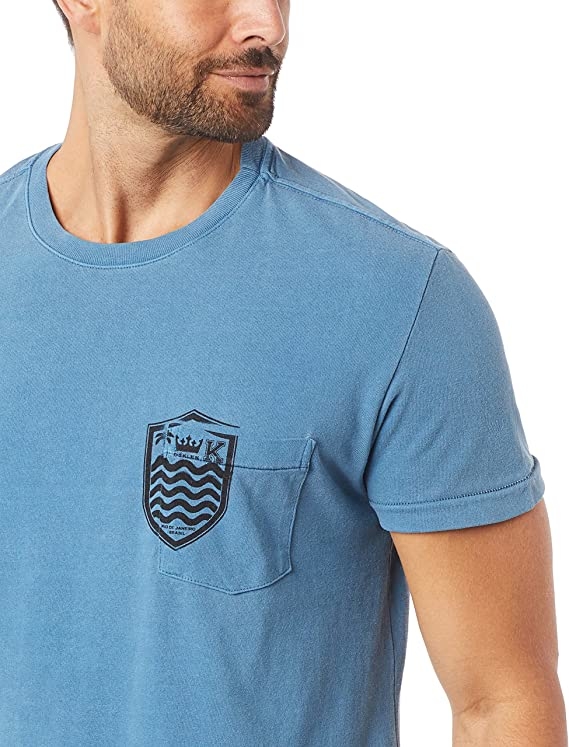 A t-shirt azul é confeccionada em malha de algodão. A peça possui gola redonda com acabamento canelado, mangas curtas, detalhamento de bolso frontal com estampa em silk na altura do tórax, caimento reto e acabamento em pesponto.