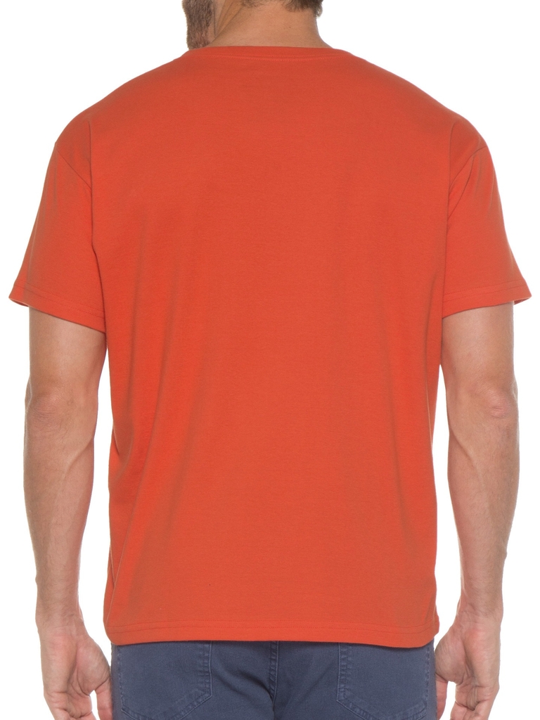 A t-shirt vermelha é confeccionada em malha de algodão. A peça possui gola careca com acabamento canelado, mangas curtas, estampa em silk e cor contrastante na parte frontal, shape solto, caimento reto e acabamento pespontado.