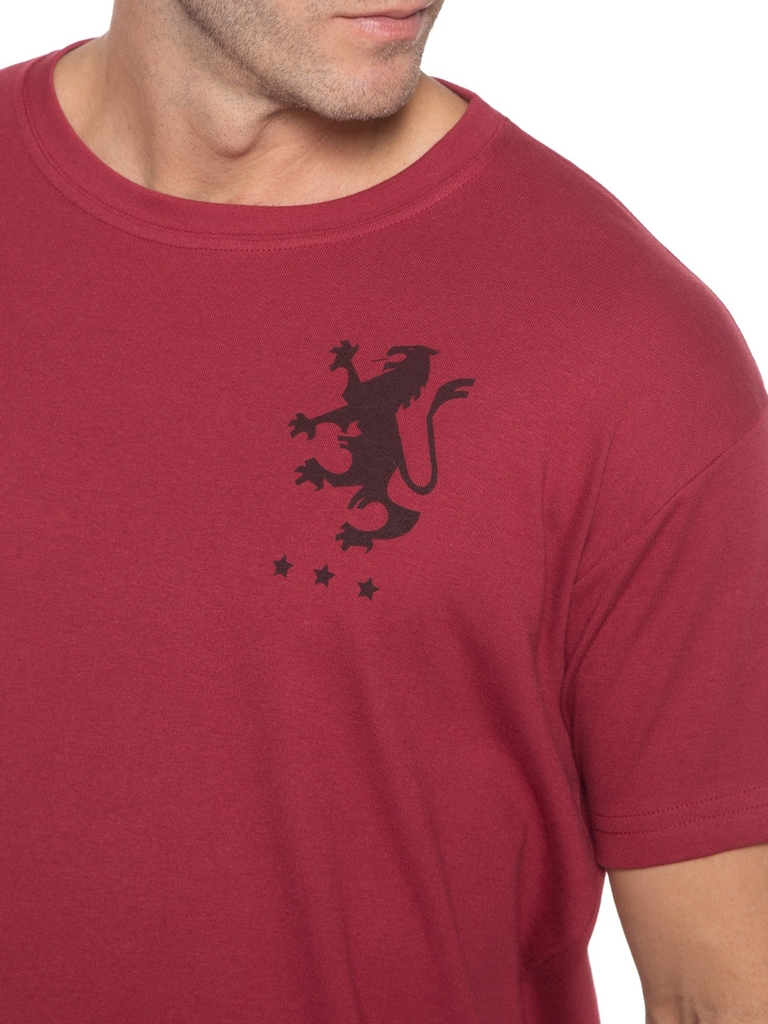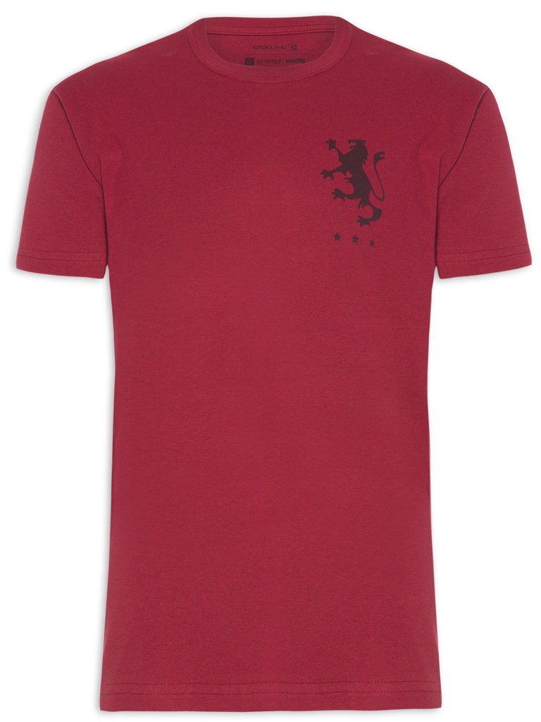 A t-shirt vermelha é confeccionada em malha. A peça possui gola redonda com acabamento canelado, mangas curtas, logo da marca aplicado na parte frontal, shape solto, caimento reto e acabamento pespontado.