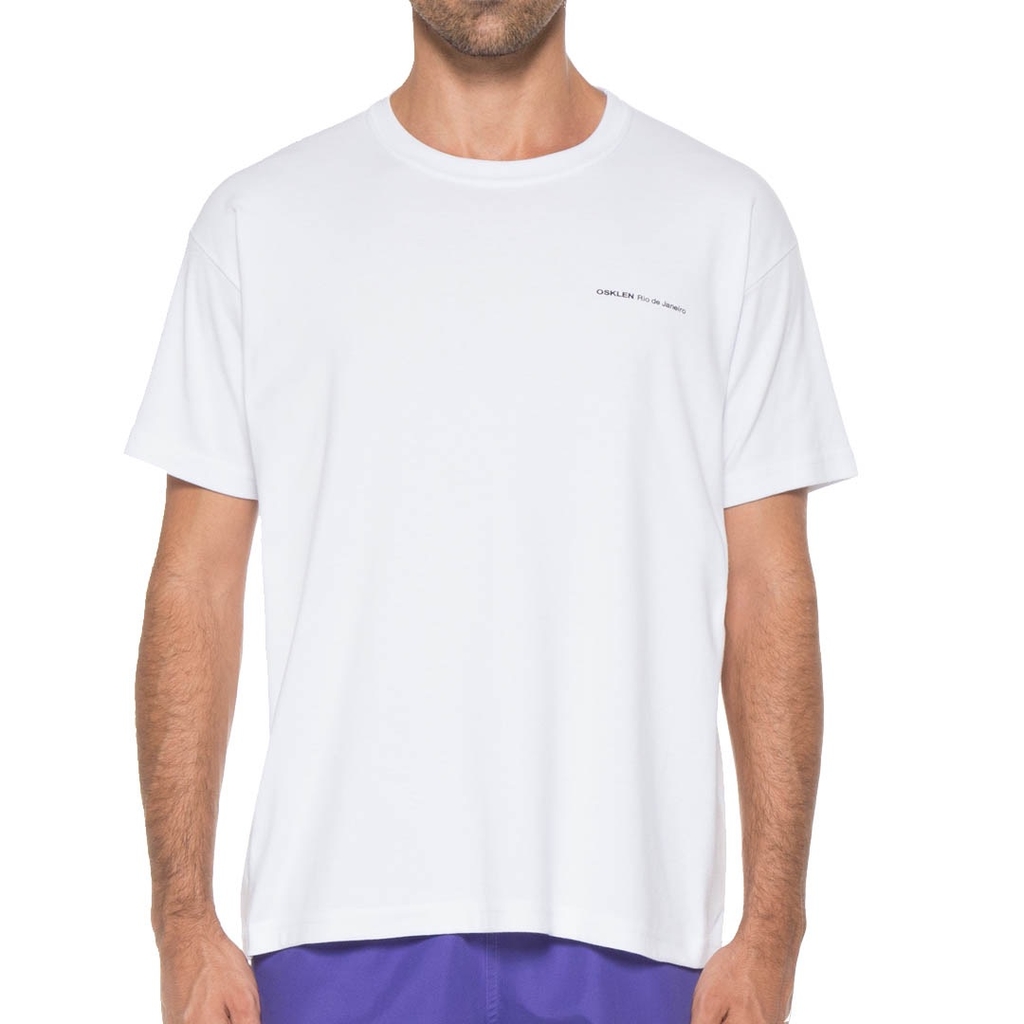 Camiseta da Osklen é confeccionada em malha de algodão. A peça de modelo Big possui gola careca com acabamento canelado, ombros estendidos, mangas curtas, estampa posterior em silk de cor contrastante e frontal em escrita, shape solto, caimento reto e acabamento pespontado.