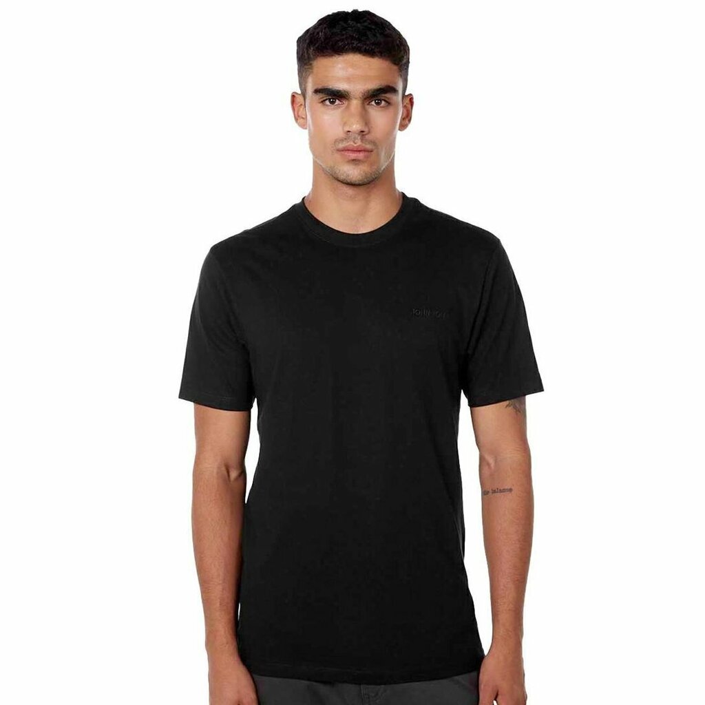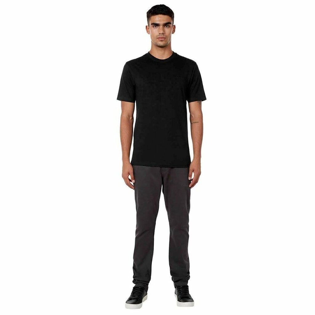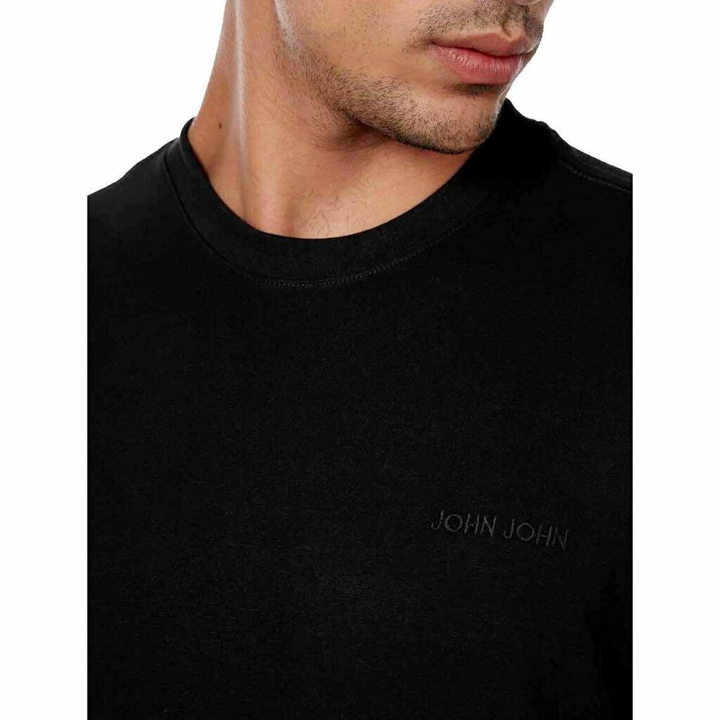 A t-shirt preta é confeccionada em malha de algodão. A peça possui gola careca com acabamento canelado, mangas curtas, estampa em cor contrastante na parte frontal e posterior, shape solto, caimento reto e acabamento pespontado.