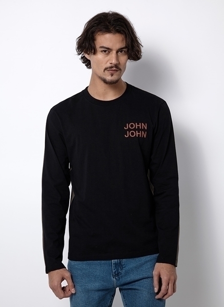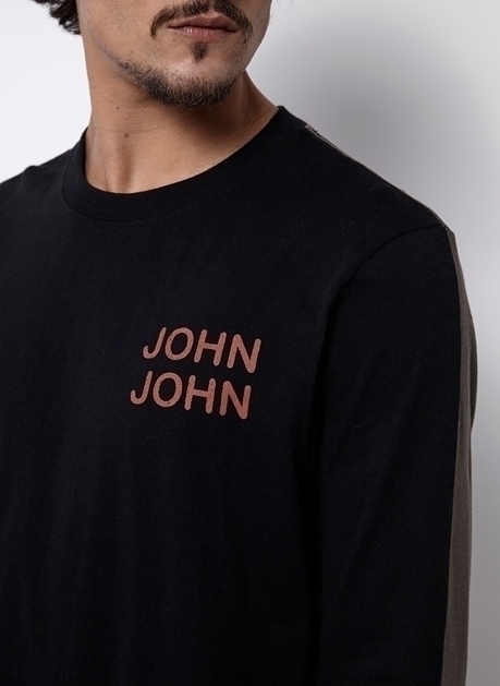 Confeccionada em malha de algodão, a Camiseta possui na modelagem manga longa, na cor preta e marrom escuro e estampa de texto no peito e costas. Funciona muito bem em looks descontraídos para o dia e noite. Ideal para usar com uma calça jeans ou bermuda de moletom.