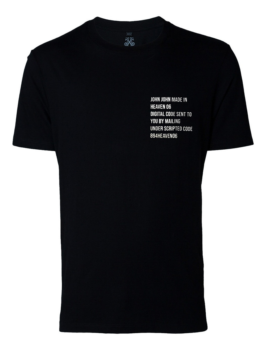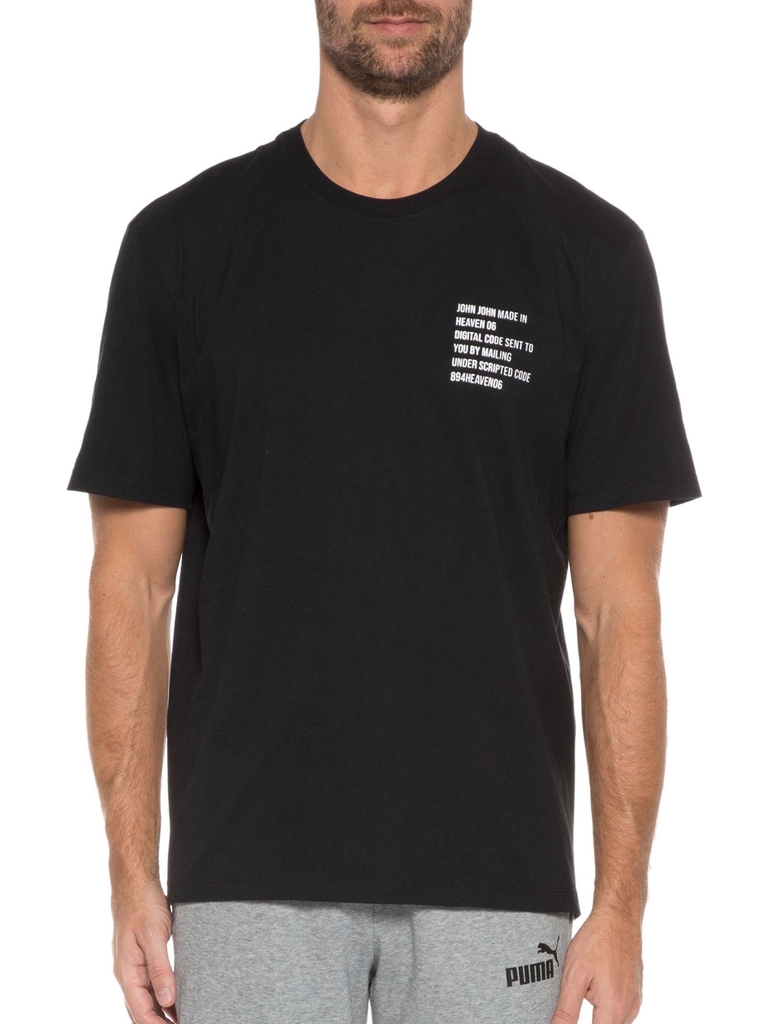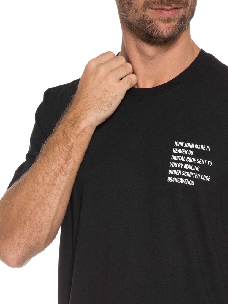 A t-shirt preta é confeccionada em malha de algodão. A peça possui gola careca com acabamento canelado, mangas curtas, estampa em cor contrastante na parte frontal e posterior, shape solto, caimento reto e acabamento pespontado.