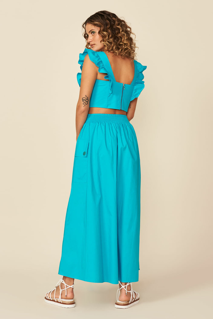 Pensando nisso, Cropped Tricoline estilo Corpete foi confeccionado com babados nas alças, que trazem um charme extra à peça e zíper nas costas para fechamento.