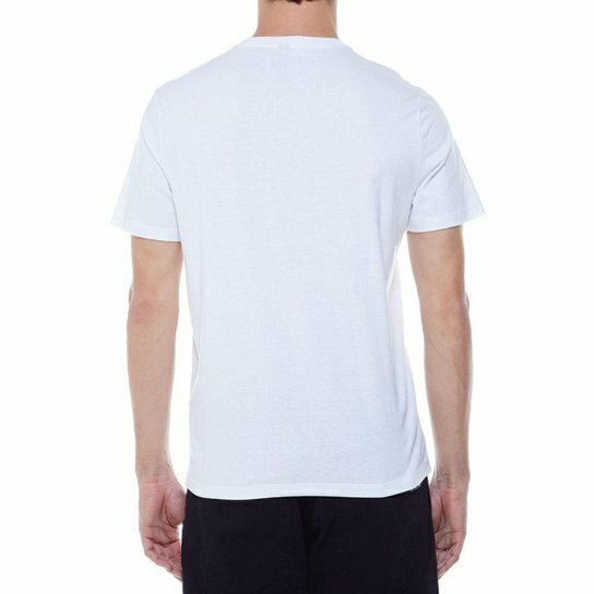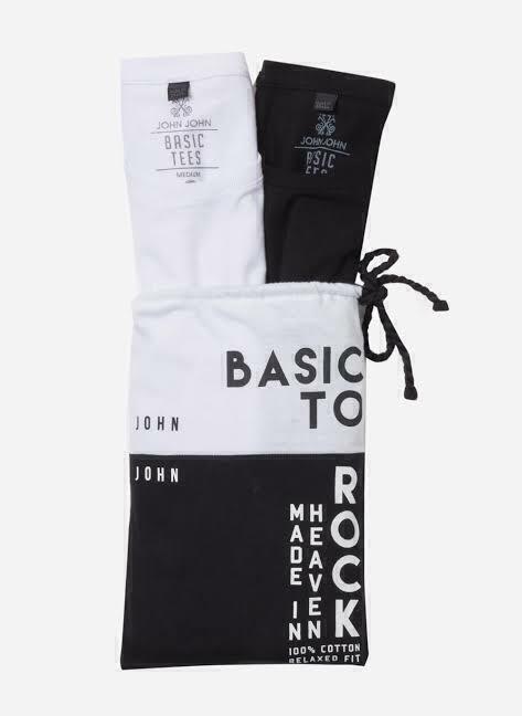 Kit com duas camisetas básicas masculinas, uma branca e uma preta, em malha de algodão com modelagem solta, gola careca e manga curta. Acompanha saquinho em malha estampado.