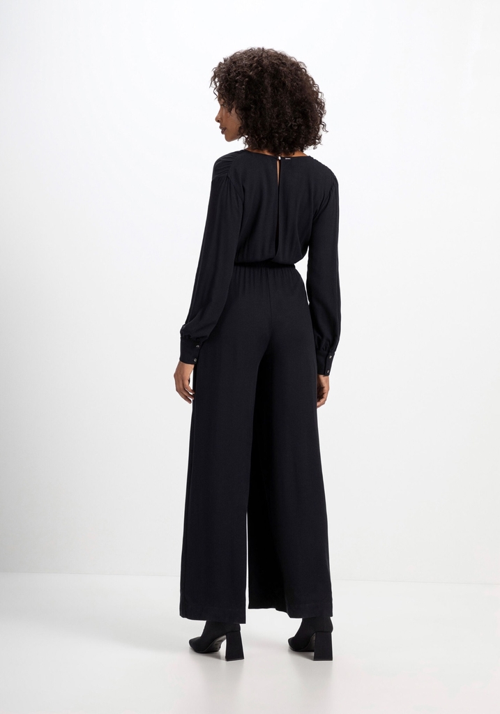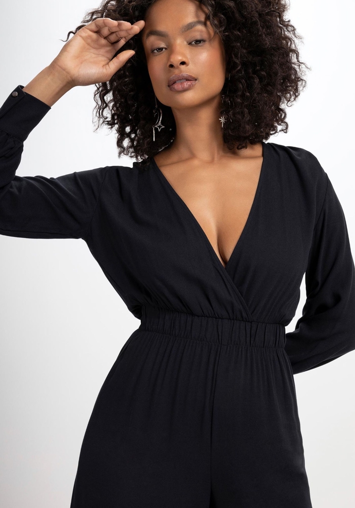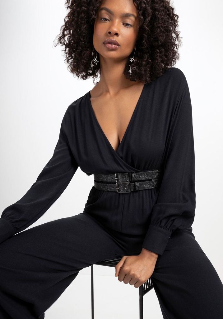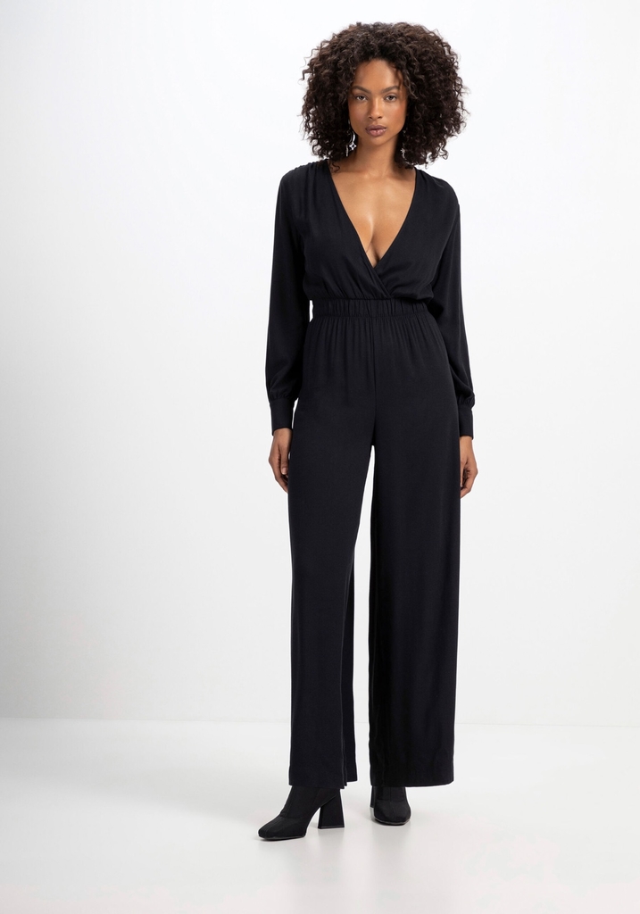 Macacão longo de mangas longas em Crepe com caimento fluido e decote transpassado que se adapta em todas as silhuetas. A peça transita de um look all black, perfeito para a noite, até uma proposta moderna com mule estampado e bolsa colorida para o dia.