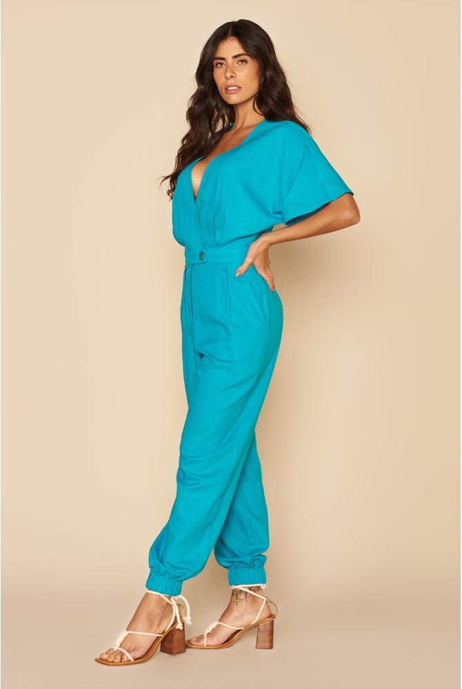 Macacão com decote em V, mangas curtas, bolsos laterais e fechamento com botão.O básico nada básico que você precisa ter no seu closet!