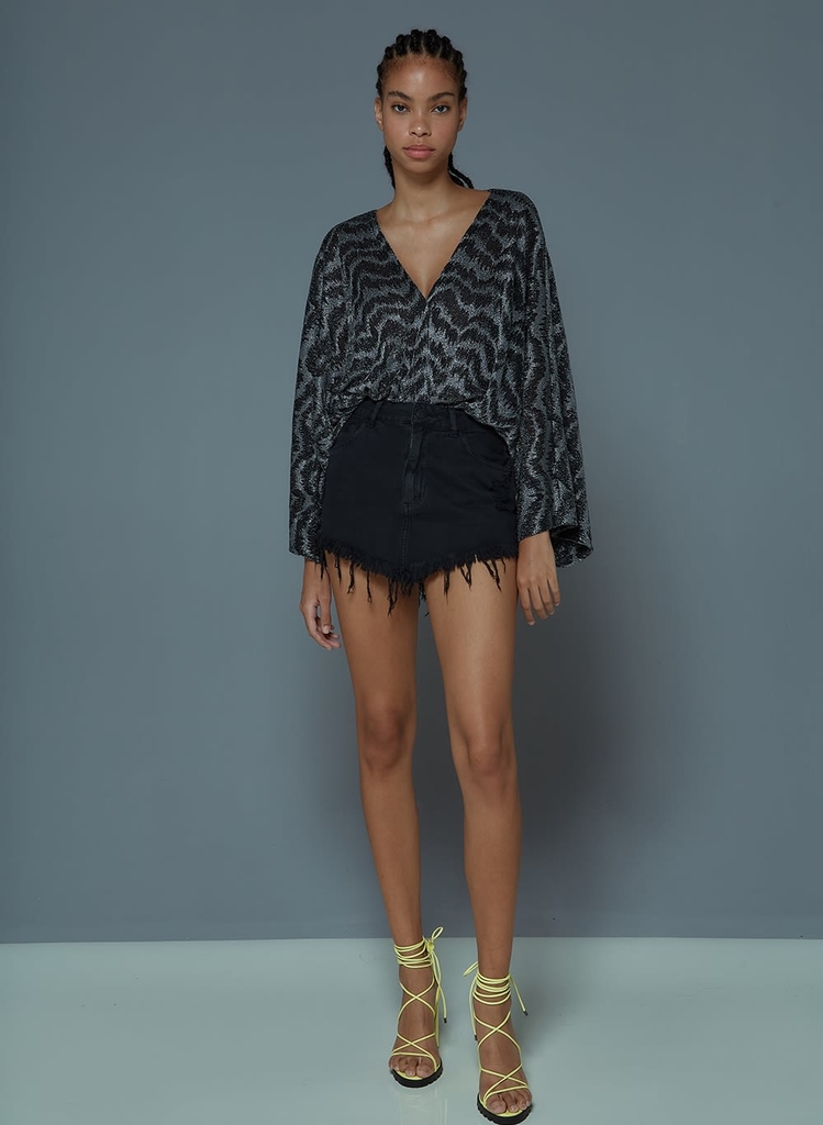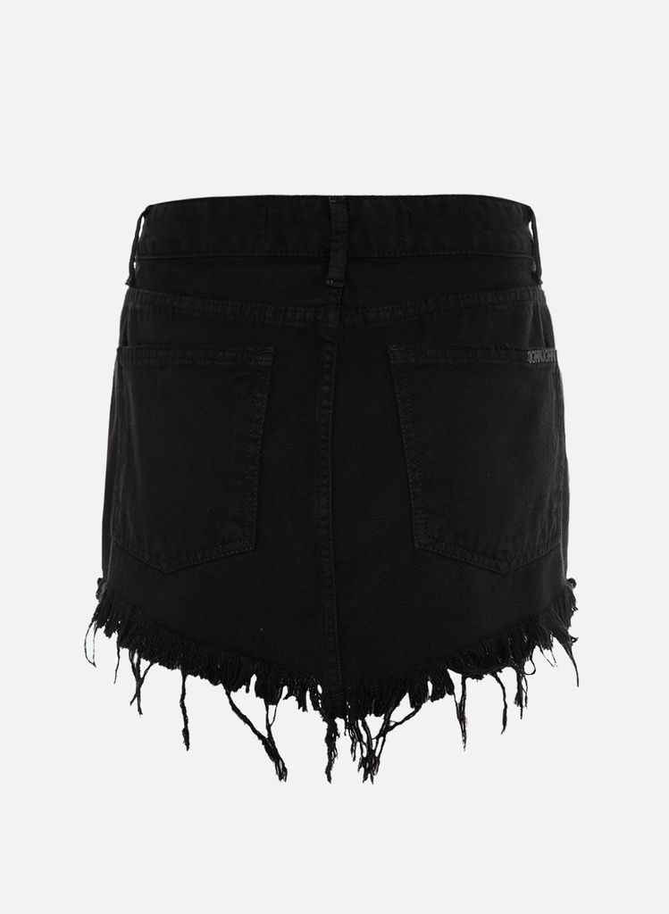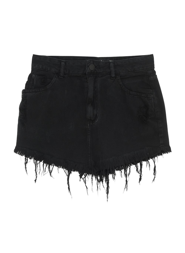 A Saia é confeccionada em sarja com lavagem escura, possui caimento reto, fechamento por zíper e botão frontal, cós com passantes, cinco bolsos, detalhes destroyed, barra desfiada e comprimento curto.