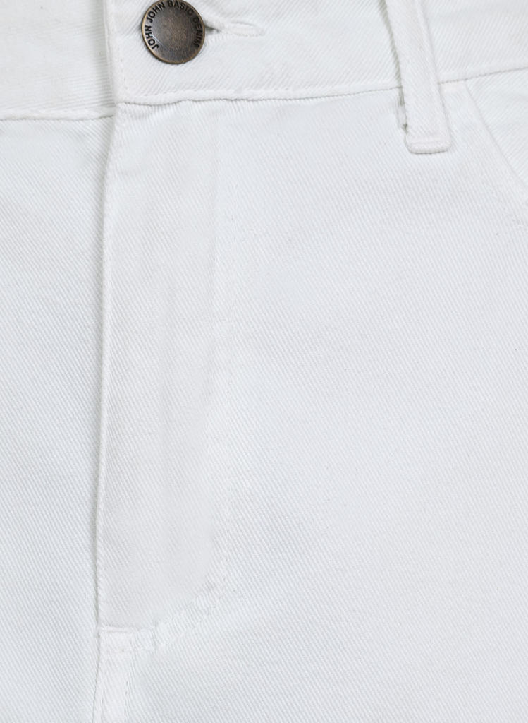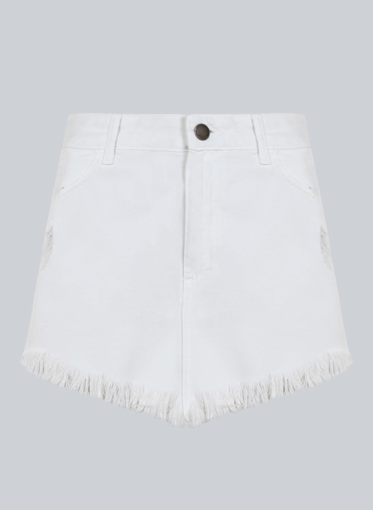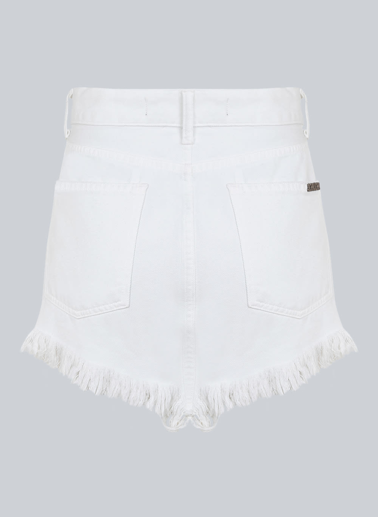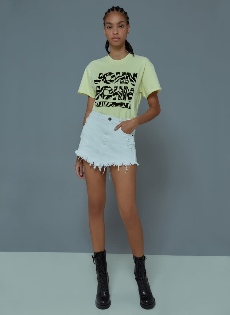 A Saia é confeccionada em sarja com lavagem clara, possui caimento reto, fechamento por zíper e botão frontal, cós com passantes, cinco bolsos, detalhes destroyed, barra desfiada e comprimento curto.