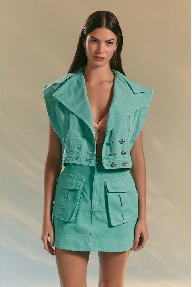 Saia confeccionada em sarja, com fechamento padrão por zíper e botão, bolsos frontais e espaço para passantes.