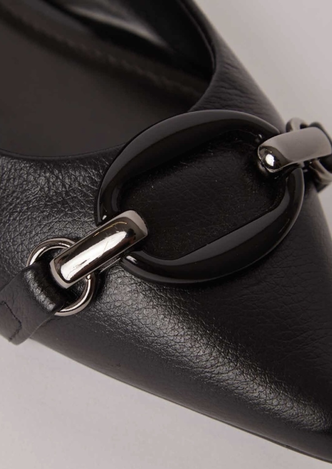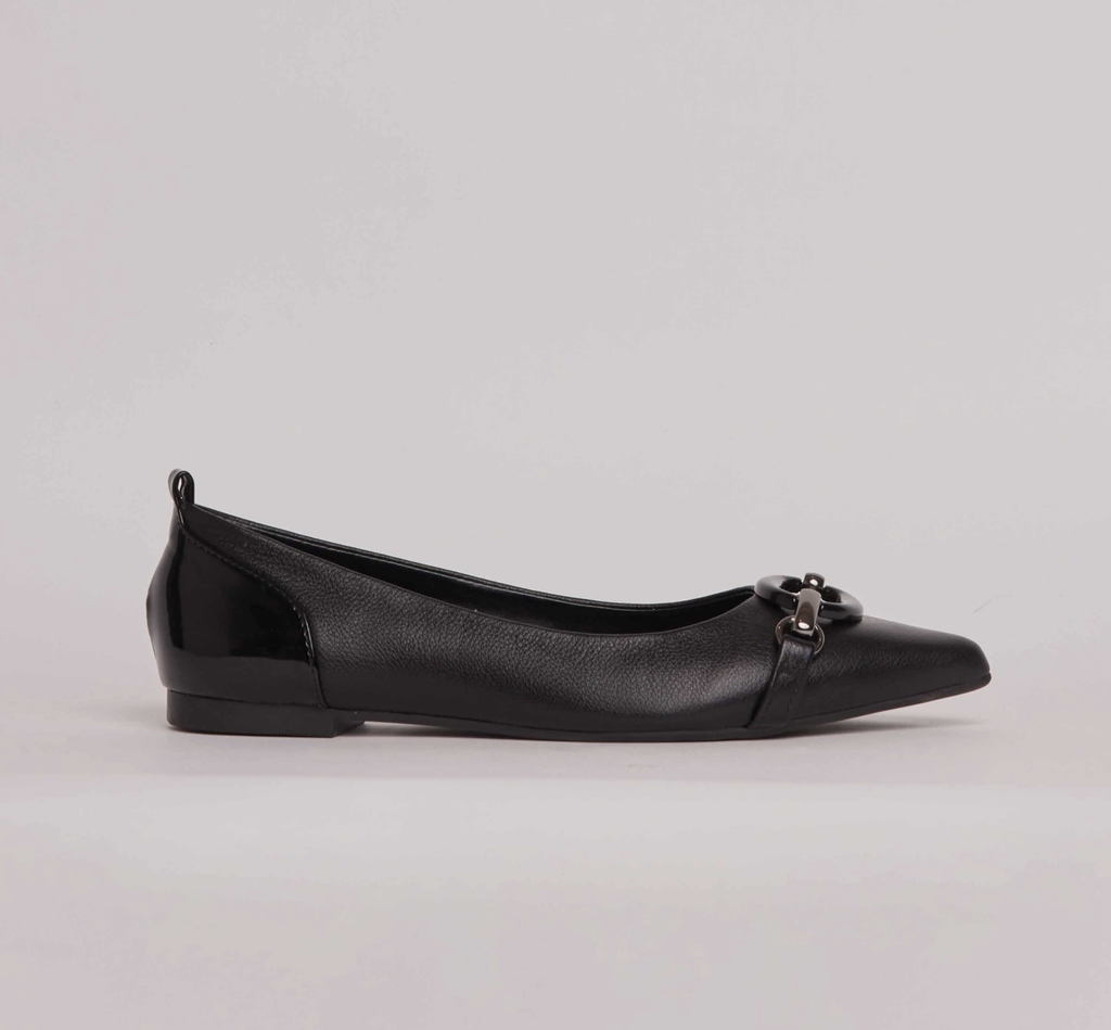 O detalhe em metal preto acrescenta um charme exclusivo, tornando a peça versátil para ser combinada tanto em looks formais quanto casuais com um toque de modernidade. Sua construção garante conforto prolongado, ideal para o dia a dia ou eventos especiais.