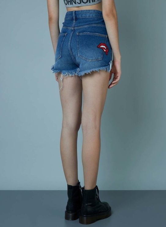 Confeccionado em jeans, o shorts possui modelagem reta, cós alto com passantes, aplicação em patch no bolso traseiro direito, fechamento frontal por zíper e botões, cinco bolsos e barra a fio.