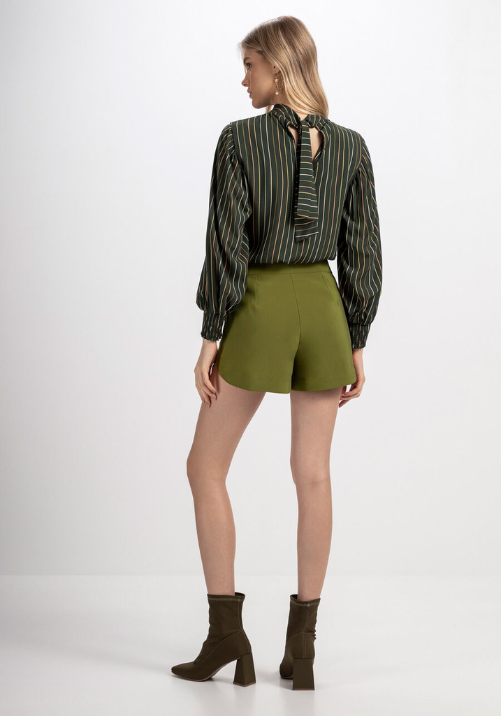 Shorts em tecido com visual acetinado e modelagem que traz um novo - e moderno - conceito à alfaiataria. A cintura é baixa, mas você também pode usá-la como cintura média, principalmente se optar por uma numeração maior para deixar a peça mais despojada.
