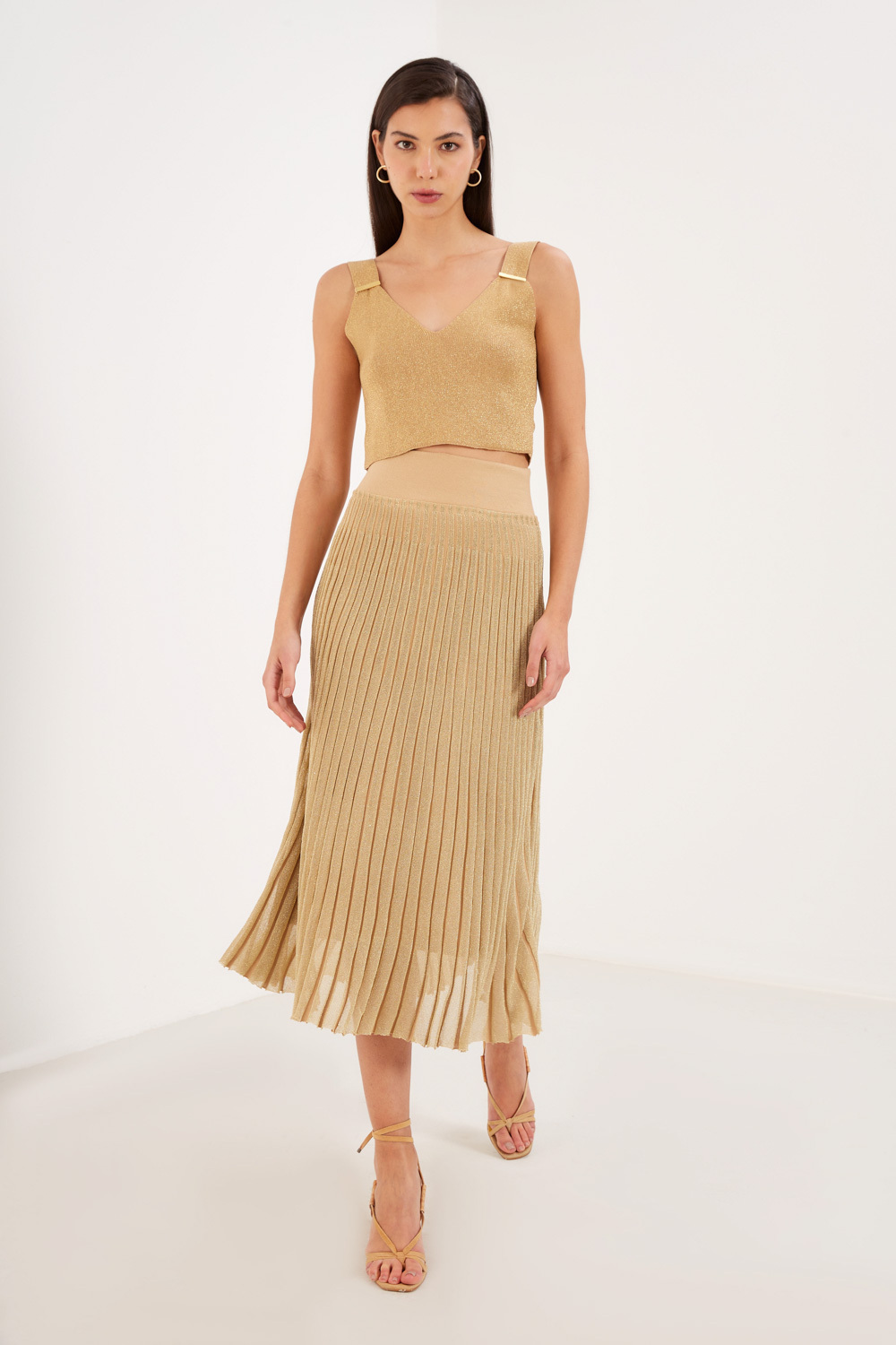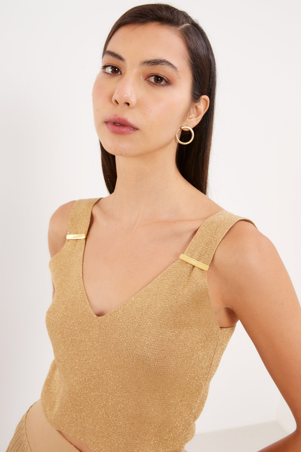 Elegante e versátil, o Top Triângulo Tricot Lurex é perfeito para qualquer ocasião. Com um corte cropped que valoriza sua silhueta, essa peça possui um decote em "V" que realça sua feminilidade, além de alças médias com detalhe dourado, adicionando um toque de sofisticação ao seu look