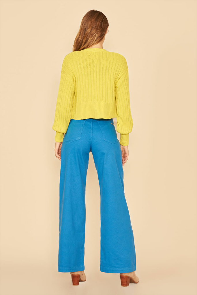 Conjunto de top e casaco confeccionados em tricot. O cropped possui decote coração e alças finas. O casaco possui mangas longas, fechamento frontal por botões e modelagem reta.