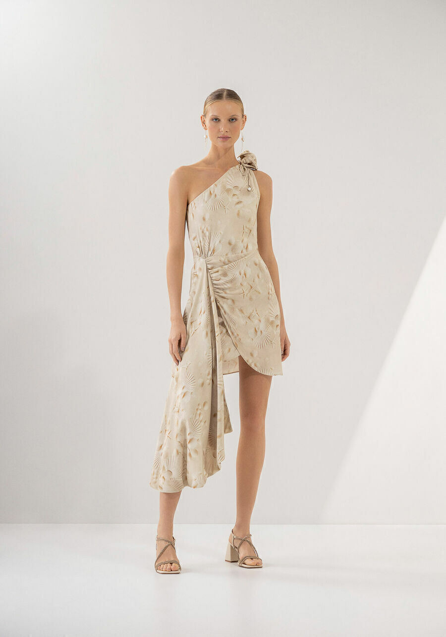 Esse vestido curto exala beleza em cada detalhe. O decote ombro só traz sofisticação com um toque urbano, enquanto o recorte formando uma ponta cria um ponto focal e o aplique de flor completa o look. A estampa - chamada Beira-mar - é inspirada pela beleza da areia combina muito bem com sandálias coloridas.