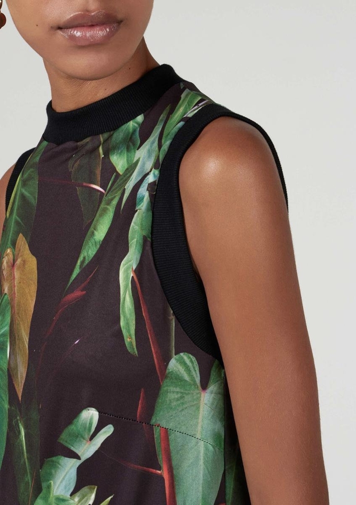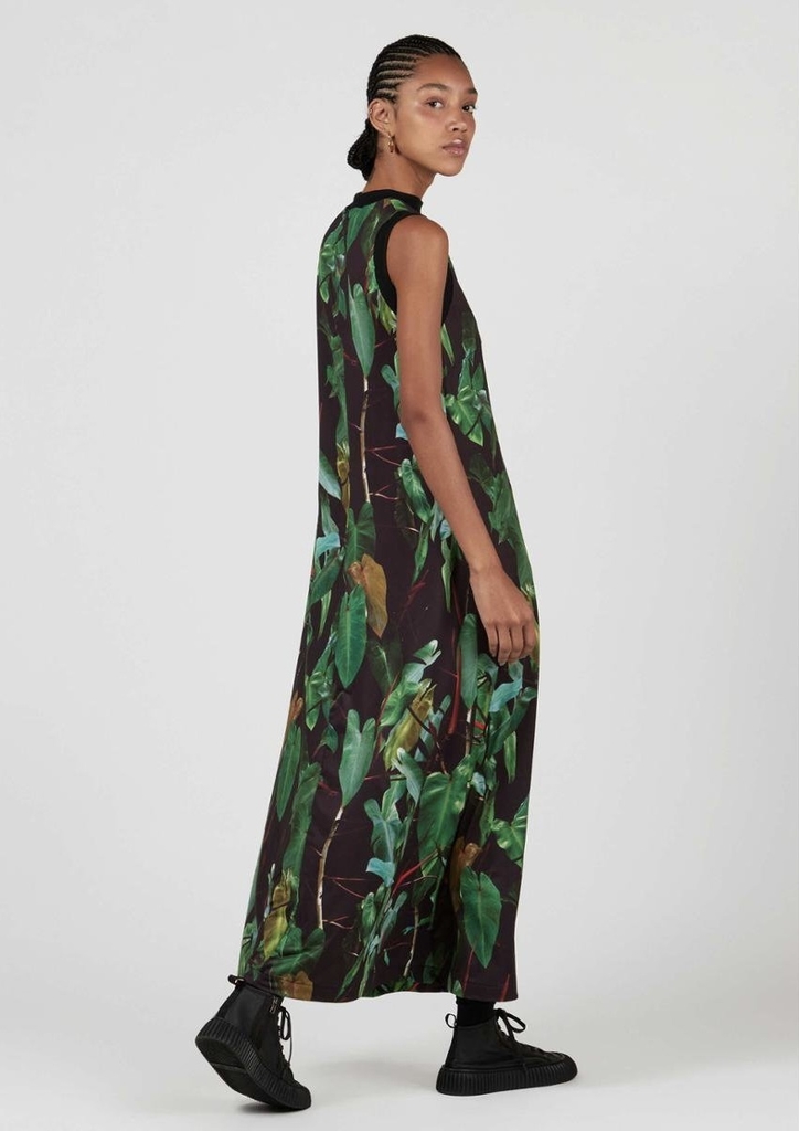 Vestido longo, com gola baixa, e sem manga. Feito na malha 'Jersey' é um tecido fluido e fresco, feito com estampa digital 'Imperador Dark'. Gola e Punho com ribana preta. Barra com bainha virada