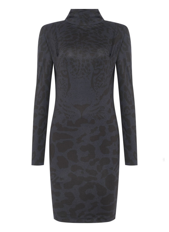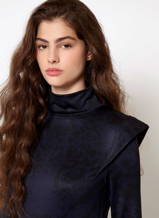 Confeccionado em material sintético, o vestido possui modelagem justa, mangas longas, gola alta, detalhe diferenciado no ombro, estampa full print, comprimento curto e acabamento pespontado.