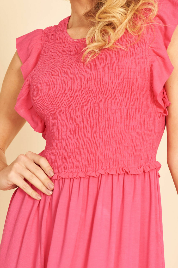 Vestido longo com lastex no busto, mangas com babados e fenda na saia.