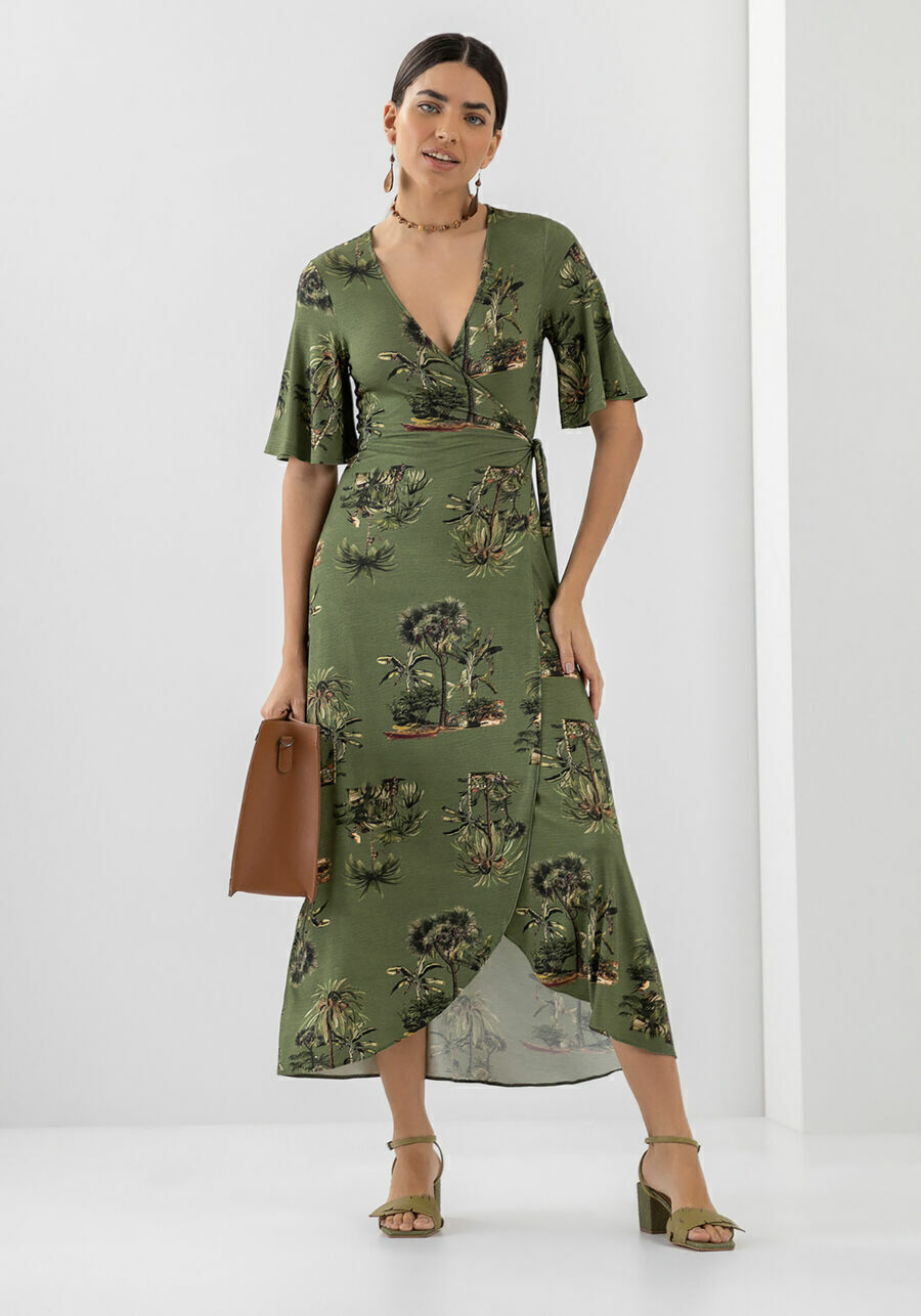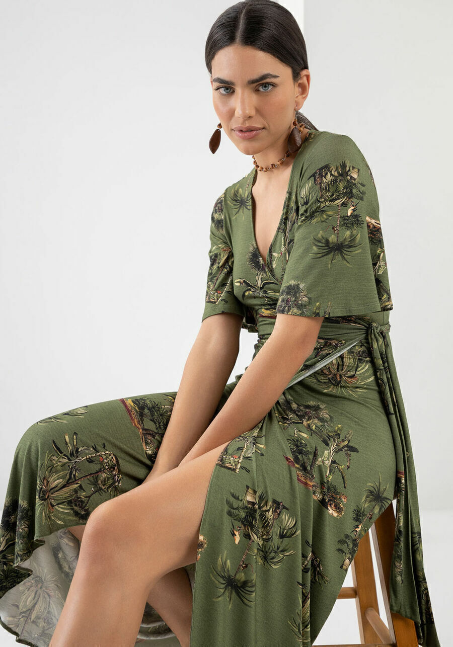 Caminhando pela natureza, deslumbre-se com a beleza. Esse vestido transpassado em malha é leve como uma brisa e sofisticado como a própria natureza. Sua estampa inspirada nas florestas brasileiras enaltece a beleza que nos cerca, ideal para combinar com sandália e desfrutar de um conceito único.