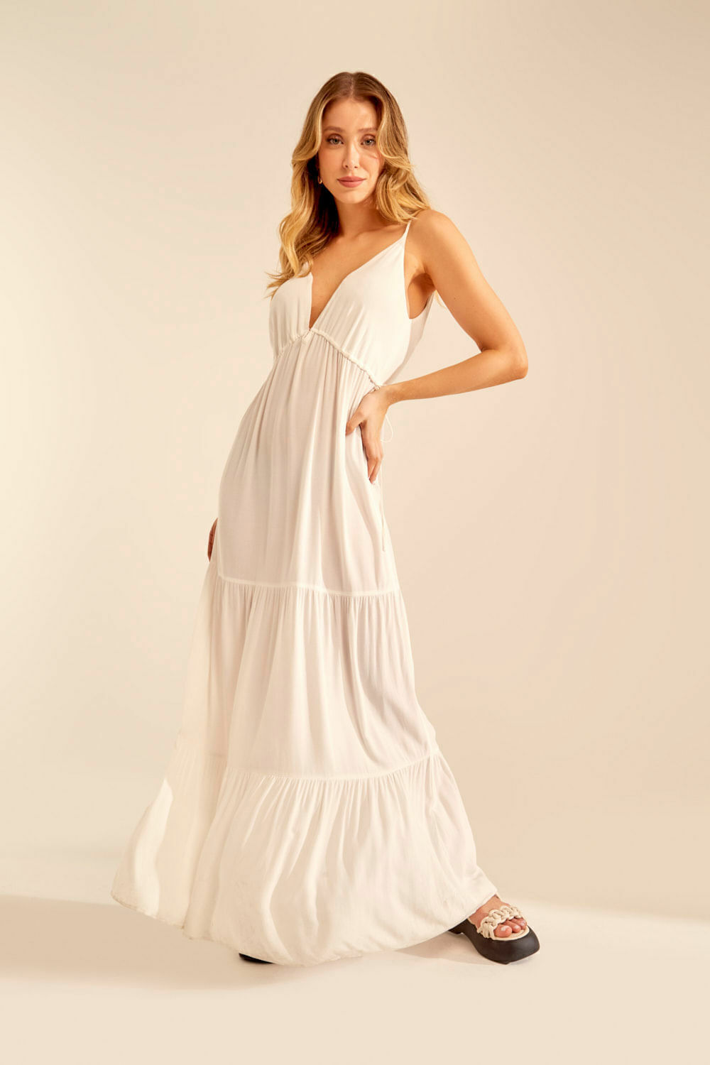 O Vestido Tecido Marias combina estilo e conforto em uma única peça. Confeccionado com materiais de alta qualidade, este vestido é perfeito para qualquer ocasião, seja um evento formal ou uma saída casual com amigos. A peça apresenta comprimento longo com babados posteriores, decote profundo em "V" e ajuste regulável no busto. Aproveite para combinar com acessórios da coleção!